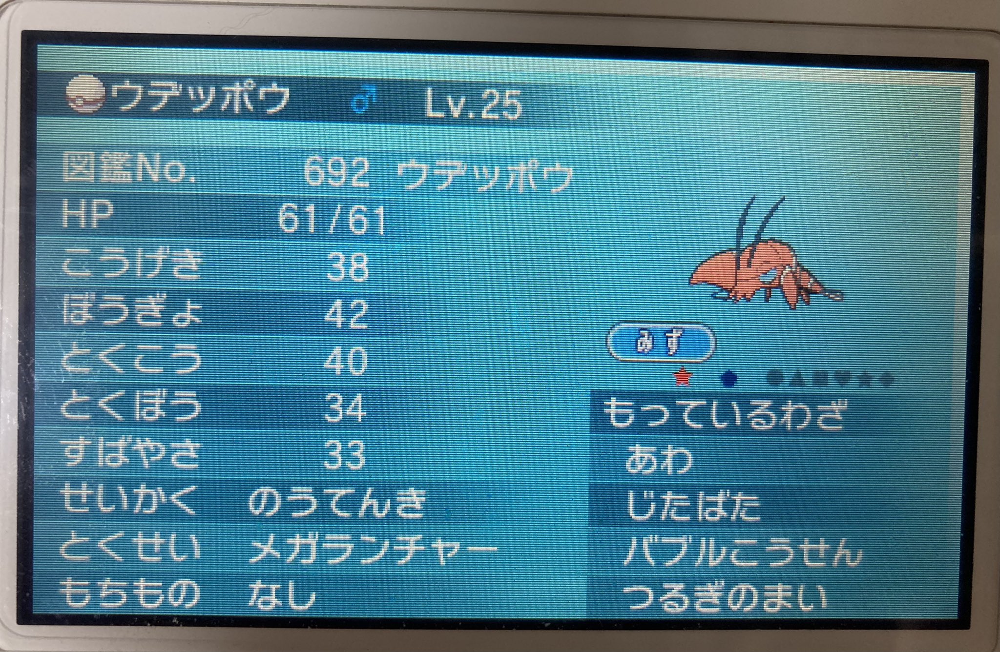 ぱんぴょ子 ポケモンxy 息子 もこう先生の影響で色違いのウデッポウ育成を決心 久しぶりに3dsを起動 連続釣りでゲット 根性ある T Co Dytmbr6brn Twitter